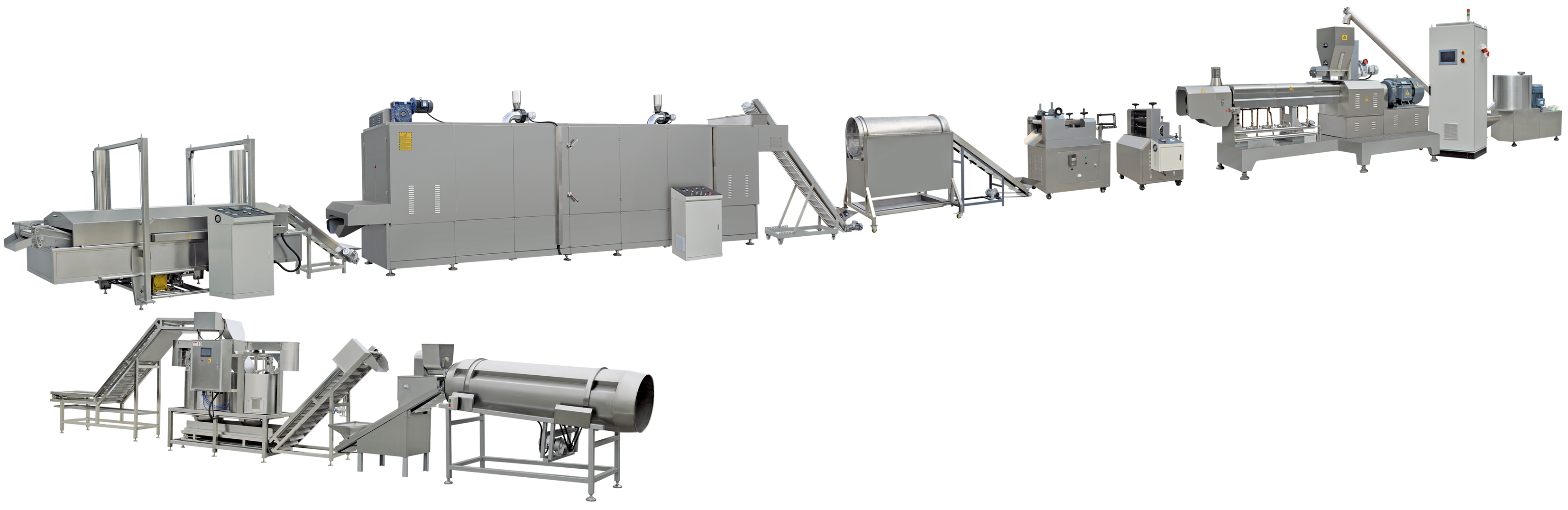 Mixer--Extruder--Pulling Cutter-Compound Shaper--Roller Drum--Vibration Cooler--Hoister--Dryer--Fryer--Flavoring