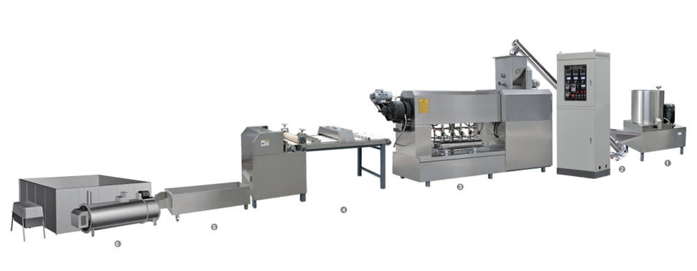 Macaroni Pasta Food Production Line adopts hard wheat flour or corn starch as the main material to produce a variety of second-extruded food in different shapes which are popular in the market, such as crispy pea, shell, screw, square tube, round tube, wave, etc. The products look glittering, translucent smooth, and beautiful and taste delicious after cooking.